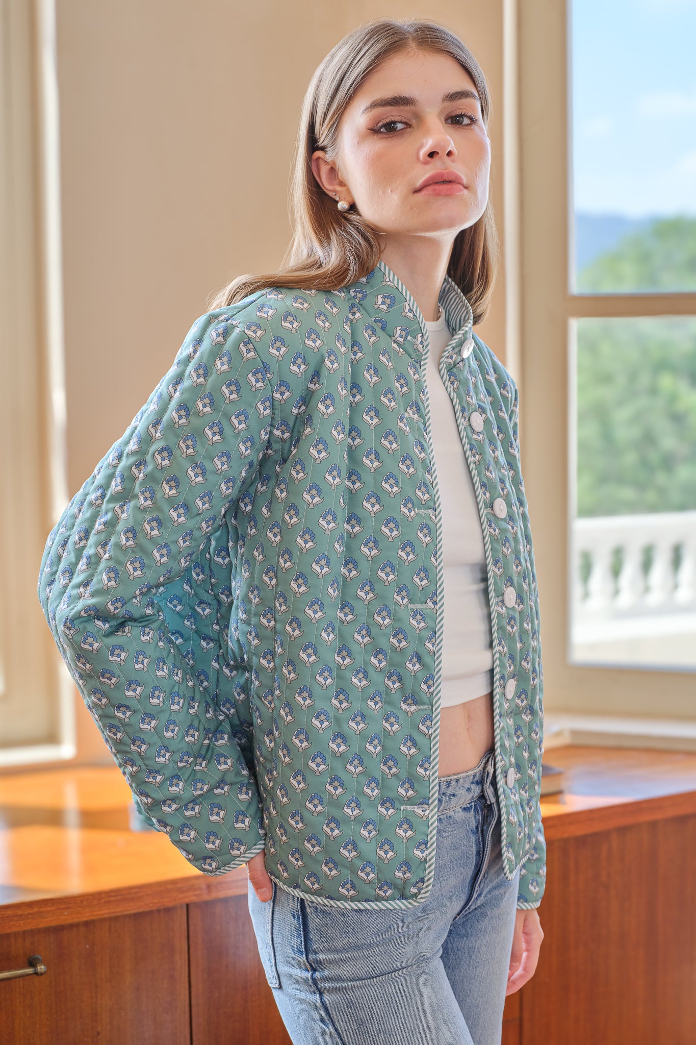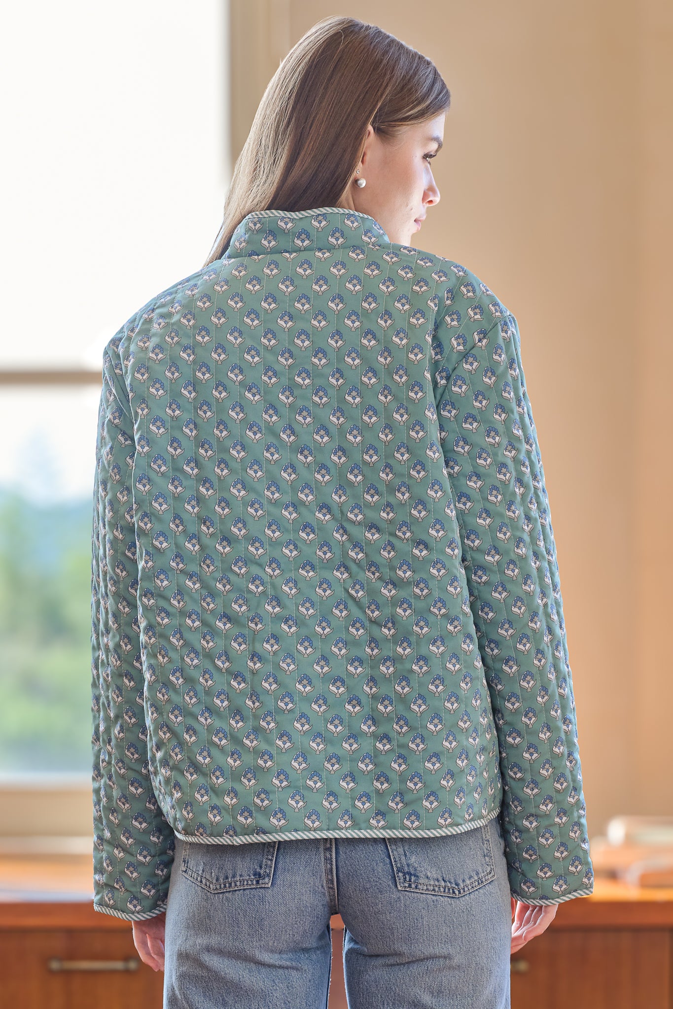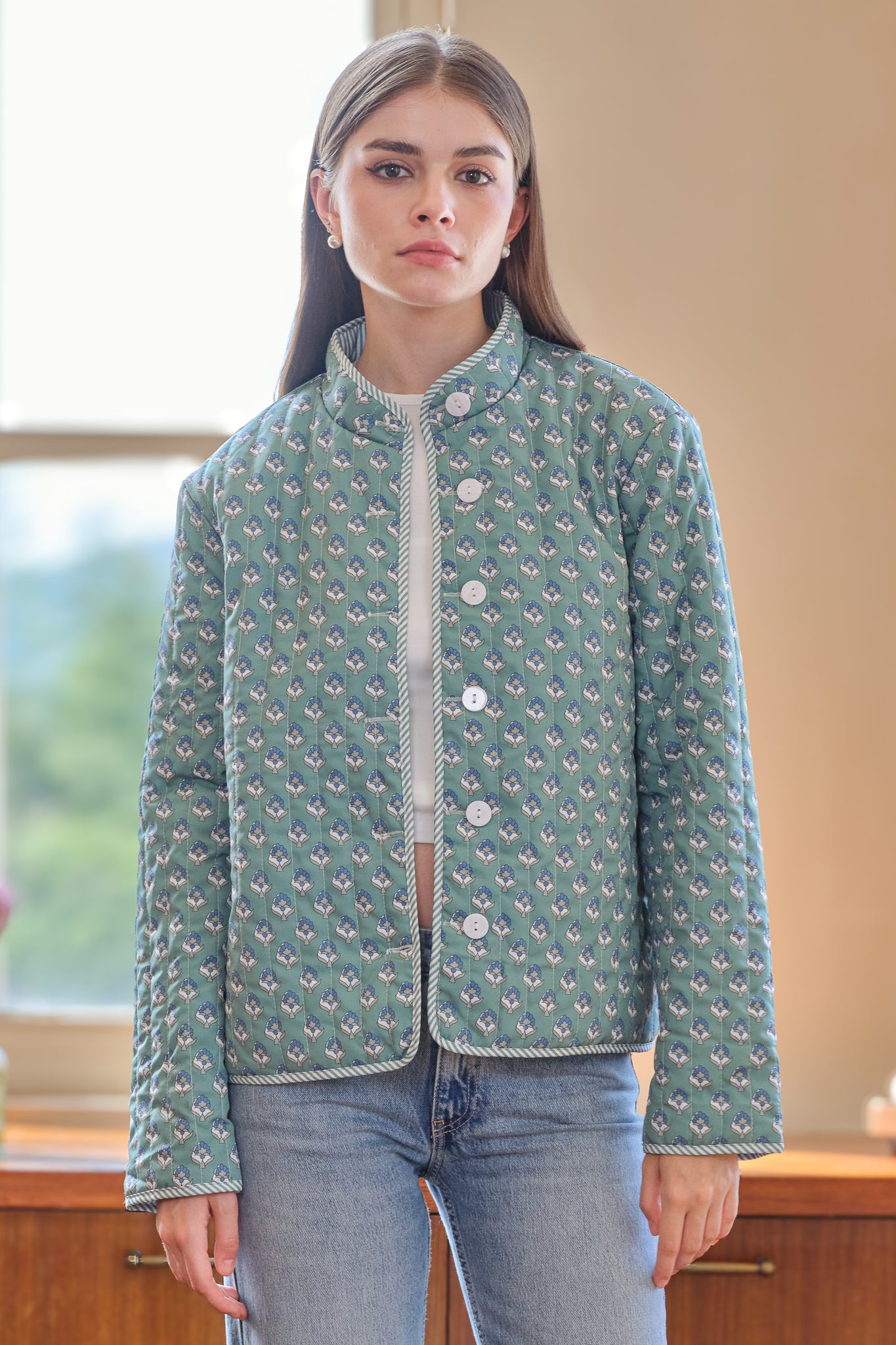 Reversible quilted jacket offers two distinct looks in one! Featuring a playful green floral print on one side and classic stripes on the other.