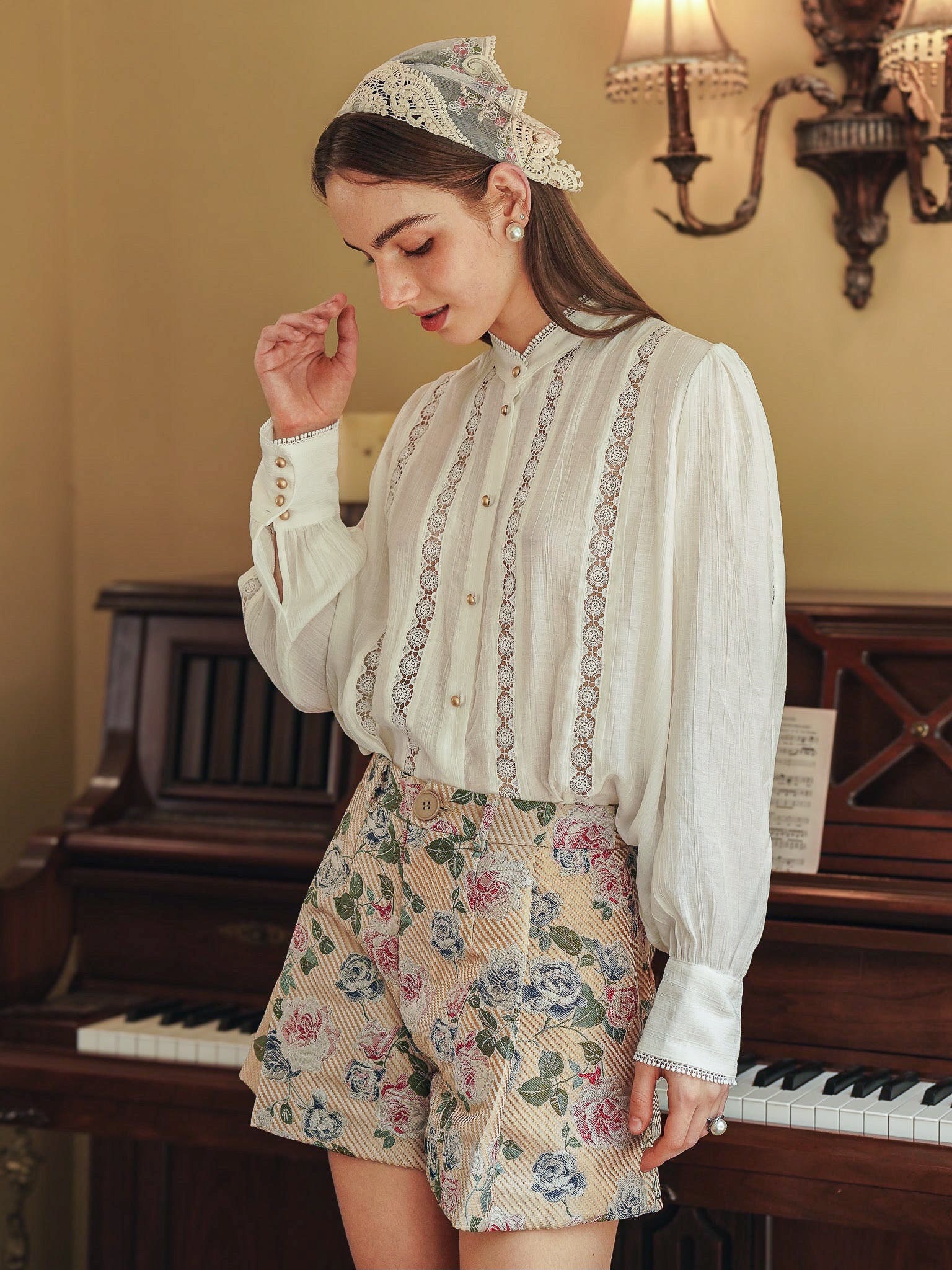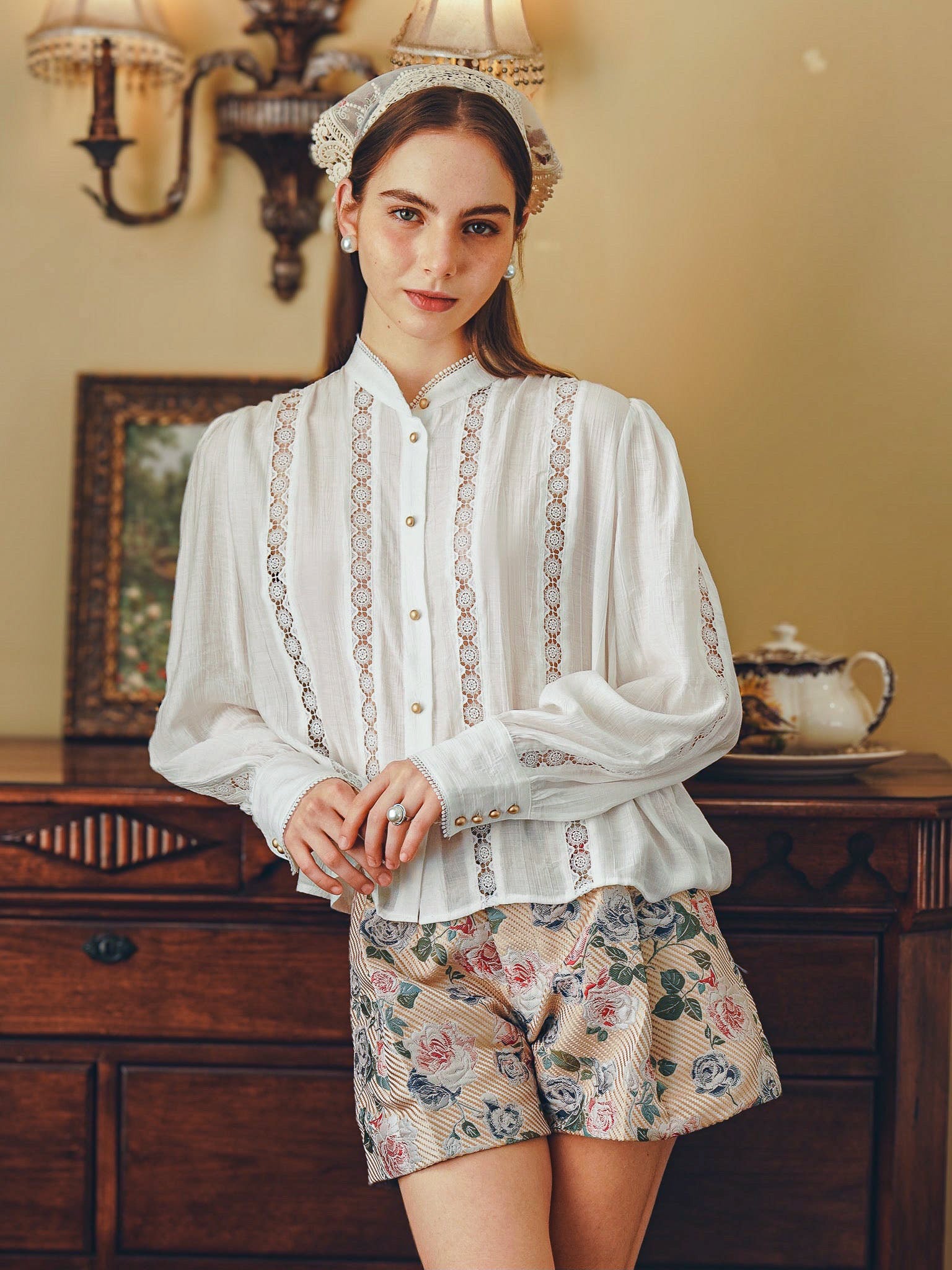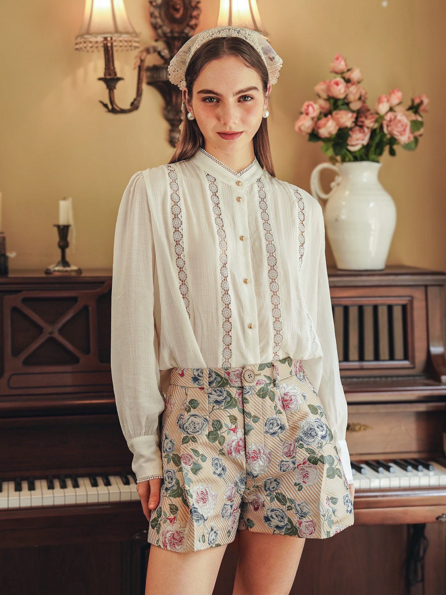 Features: Intricate lace trim that vertically adorns the front. Each lace panel is outlined with a subtle, decorative edging. High neckline and long sleeves.