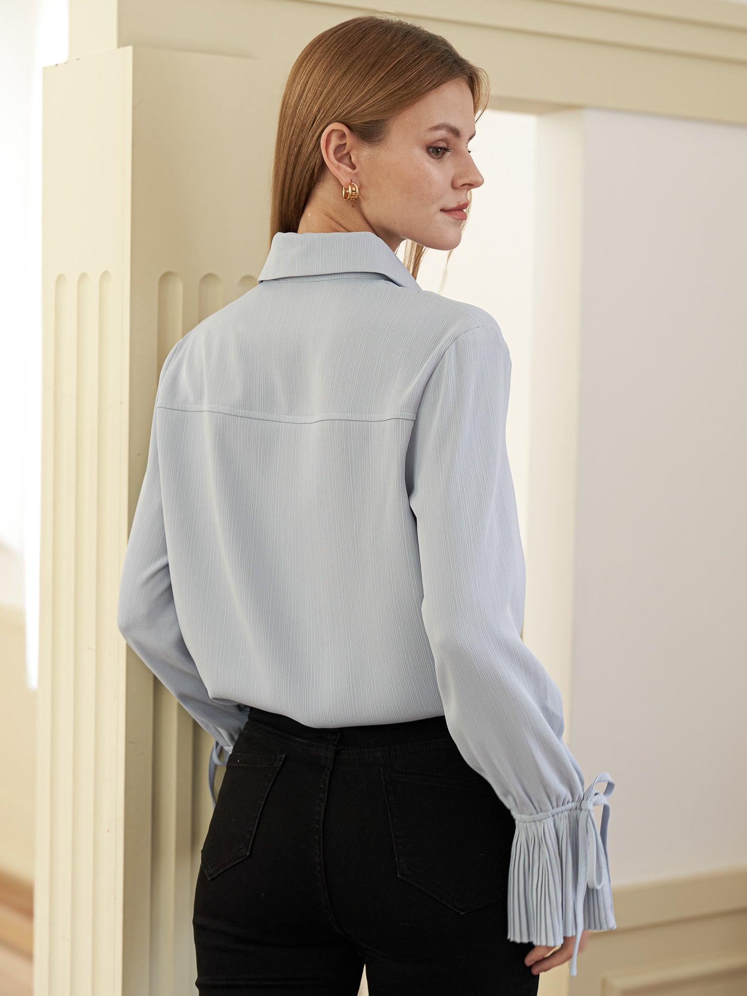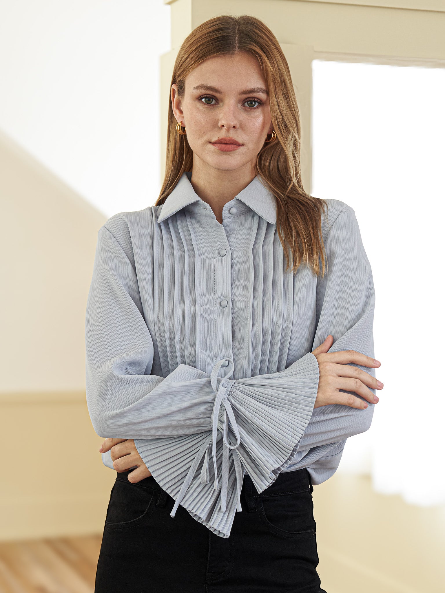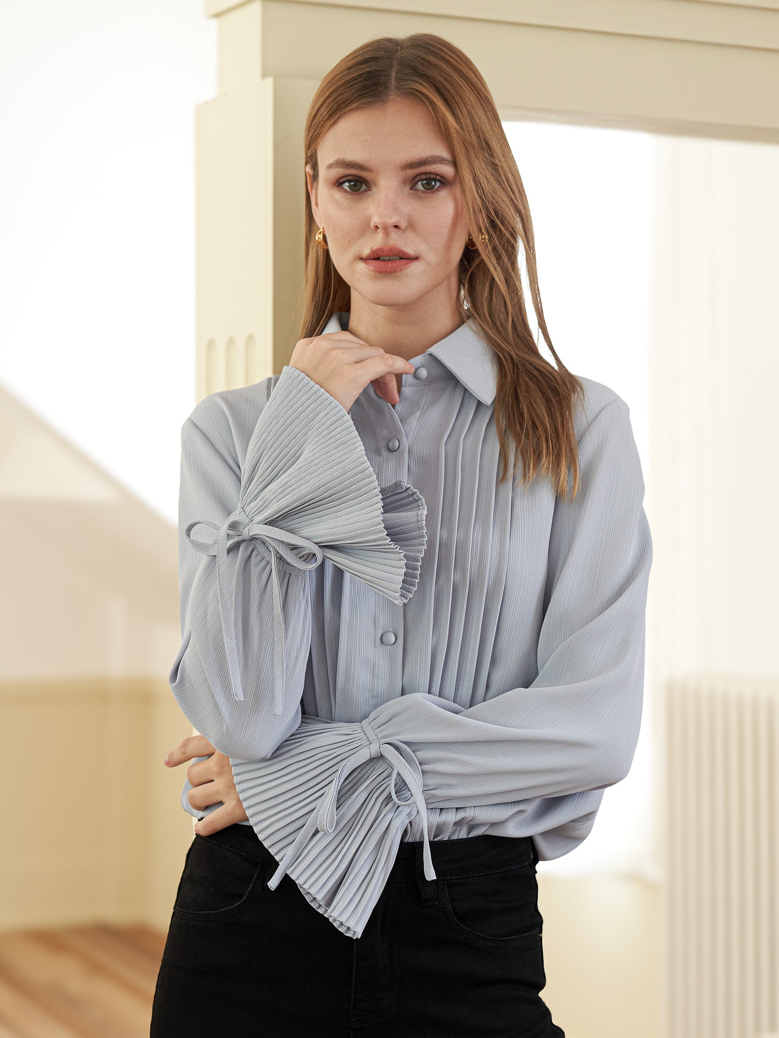 Features: Pleated details along the front and sleeves. The elegant cuffs with tie accents add a touch of charm