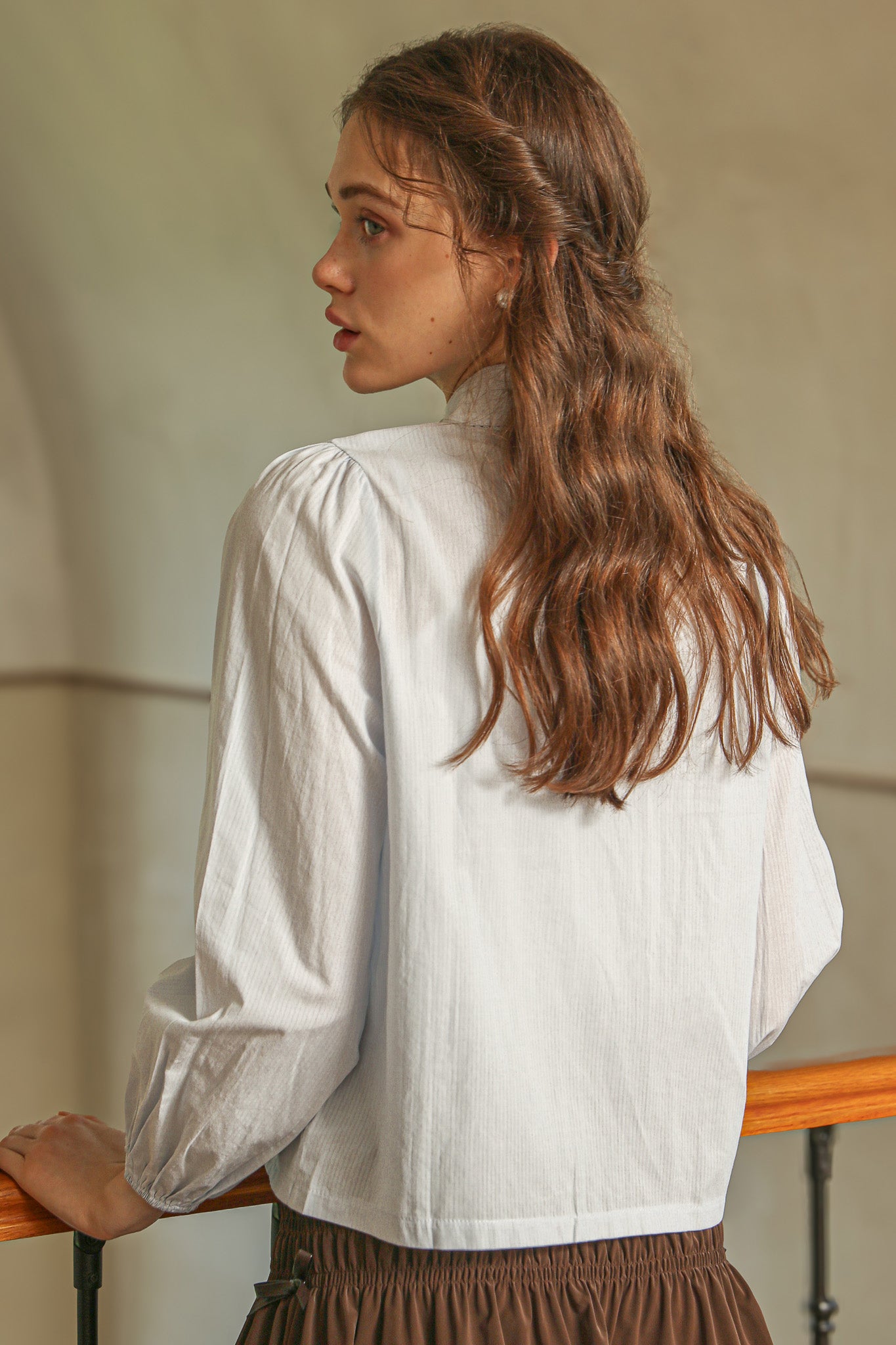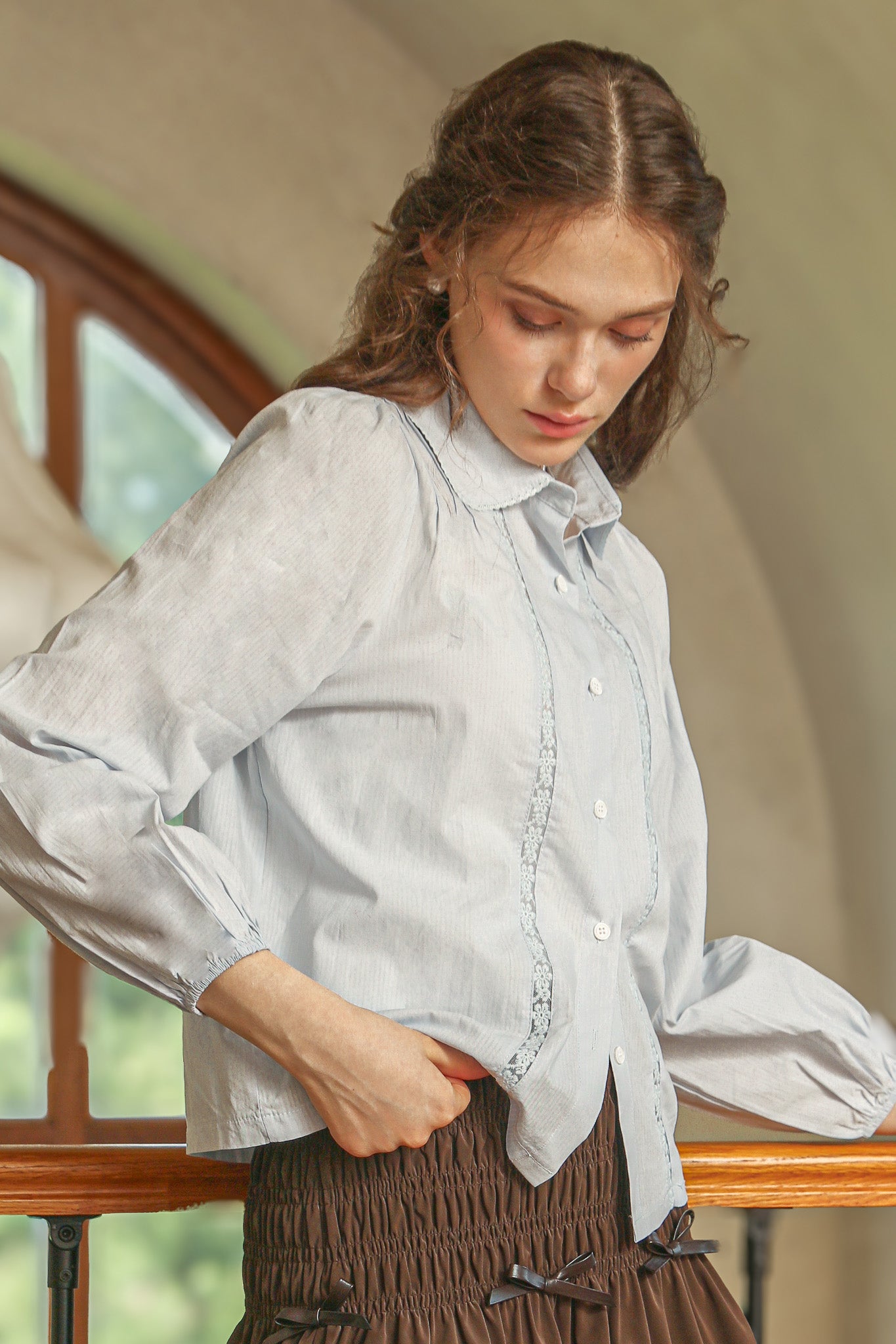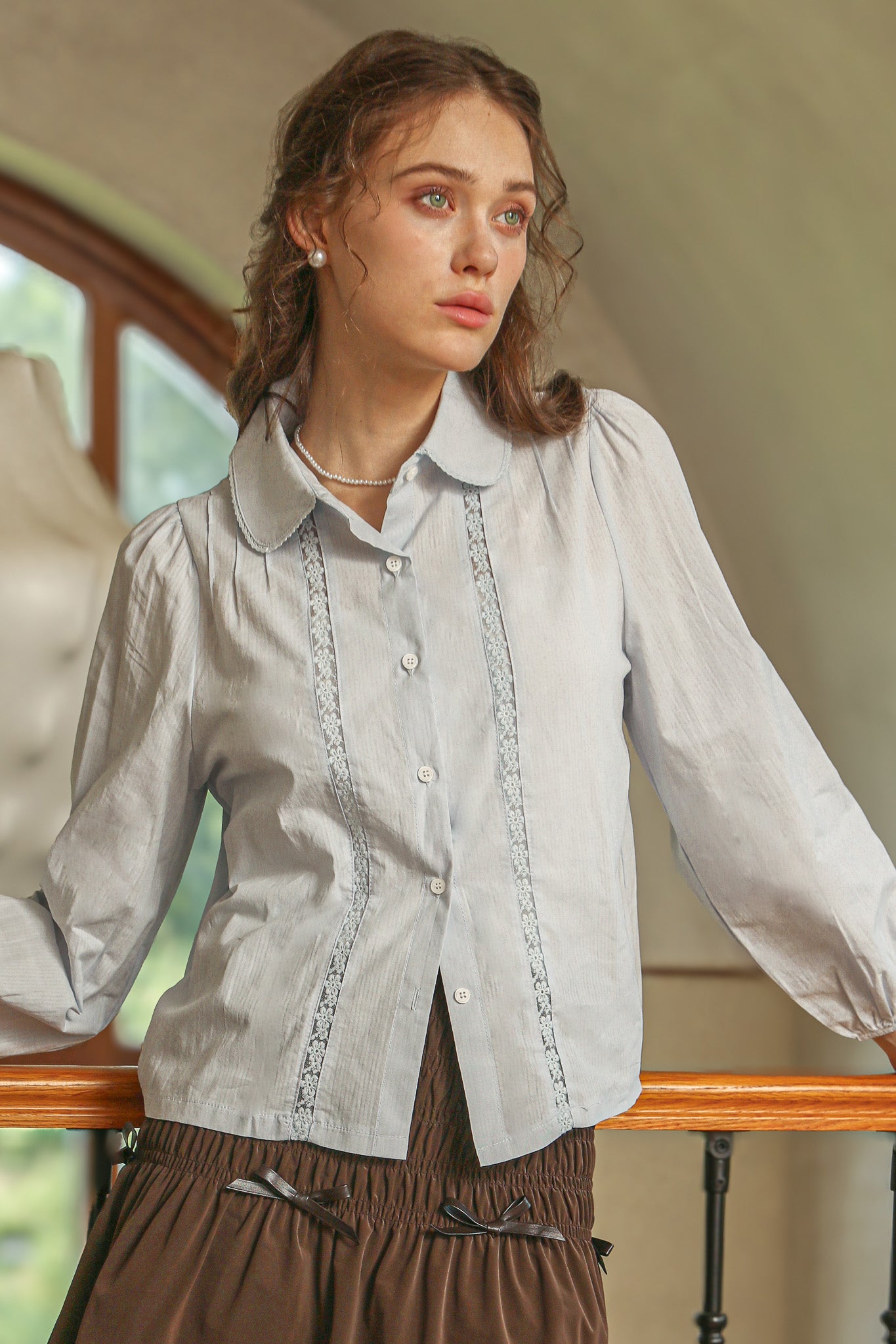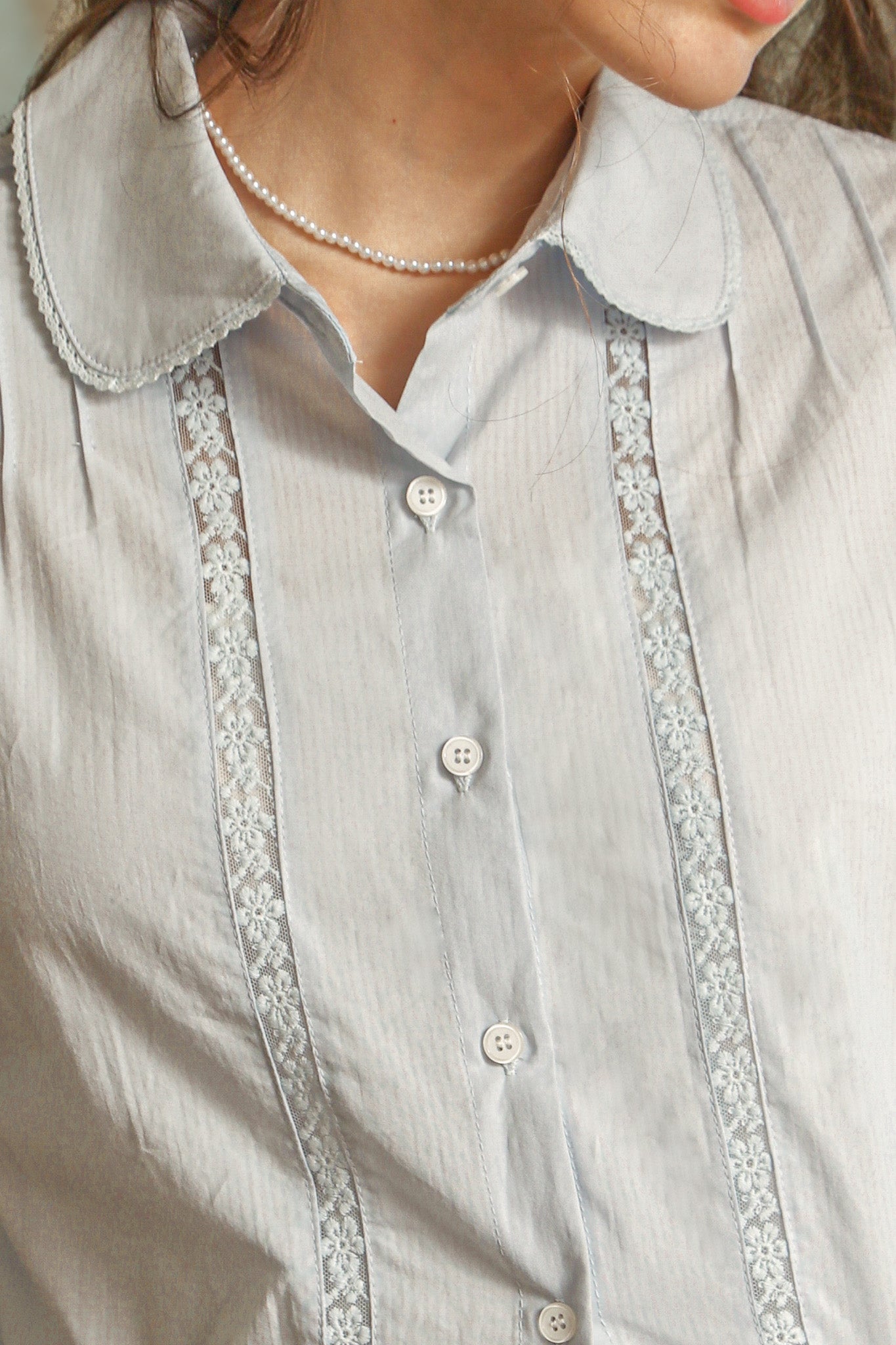 Powder blue blouse features delicate lace trims along the collar and front, adding a vintage-inspired charm.