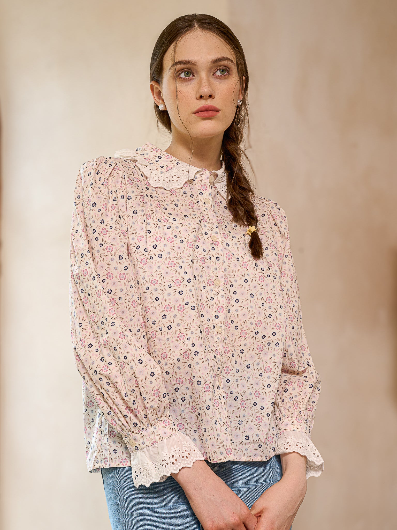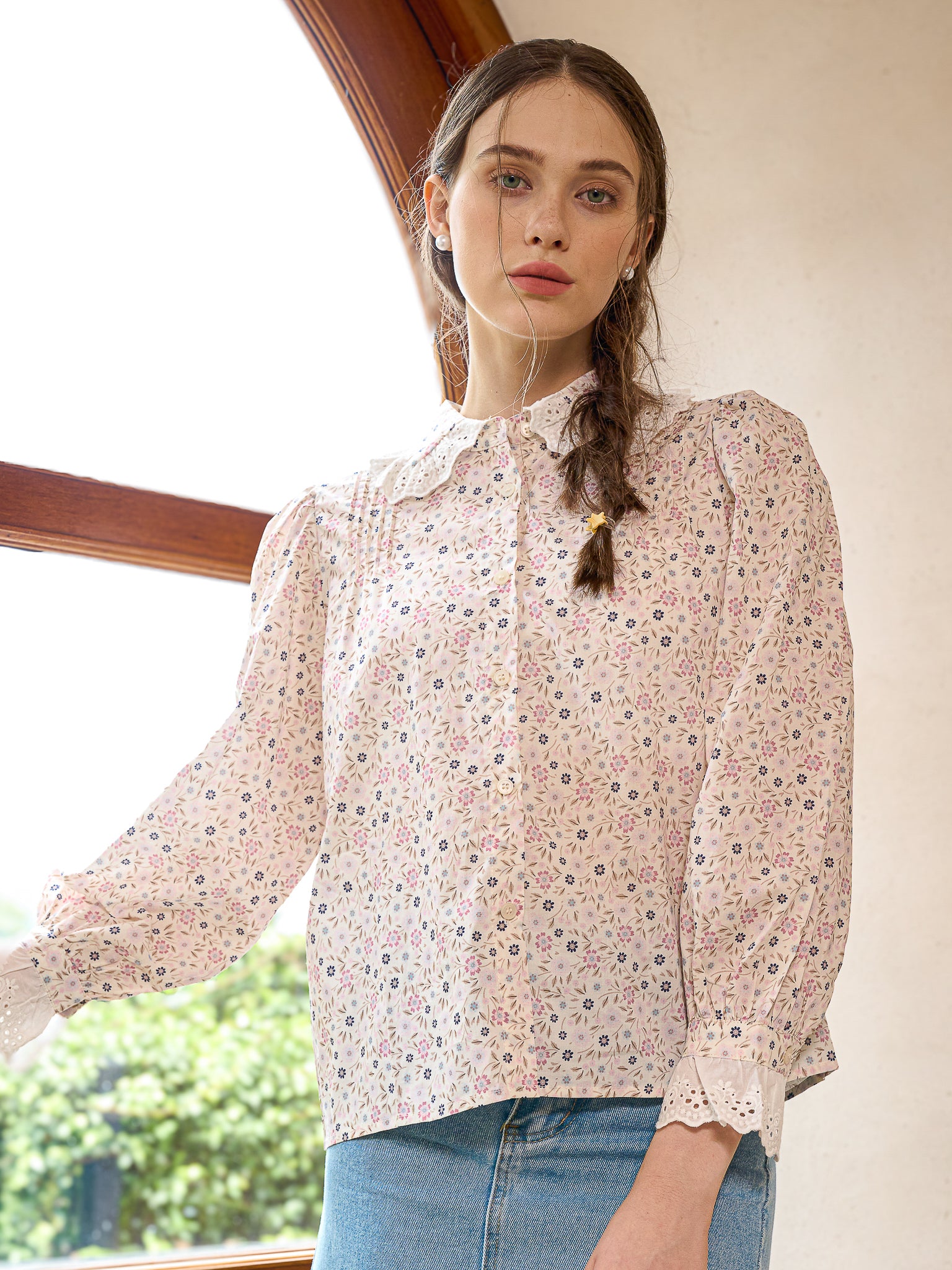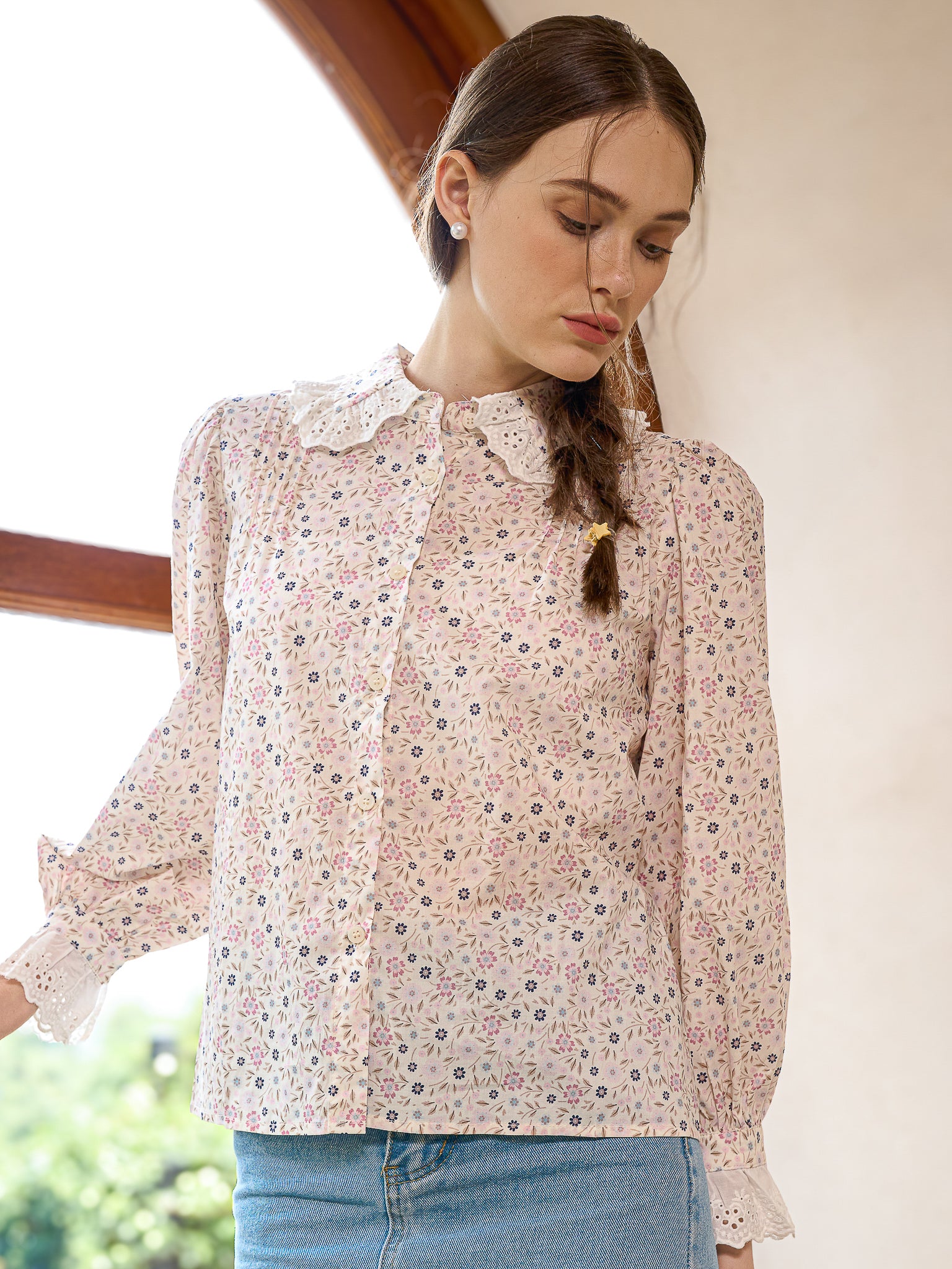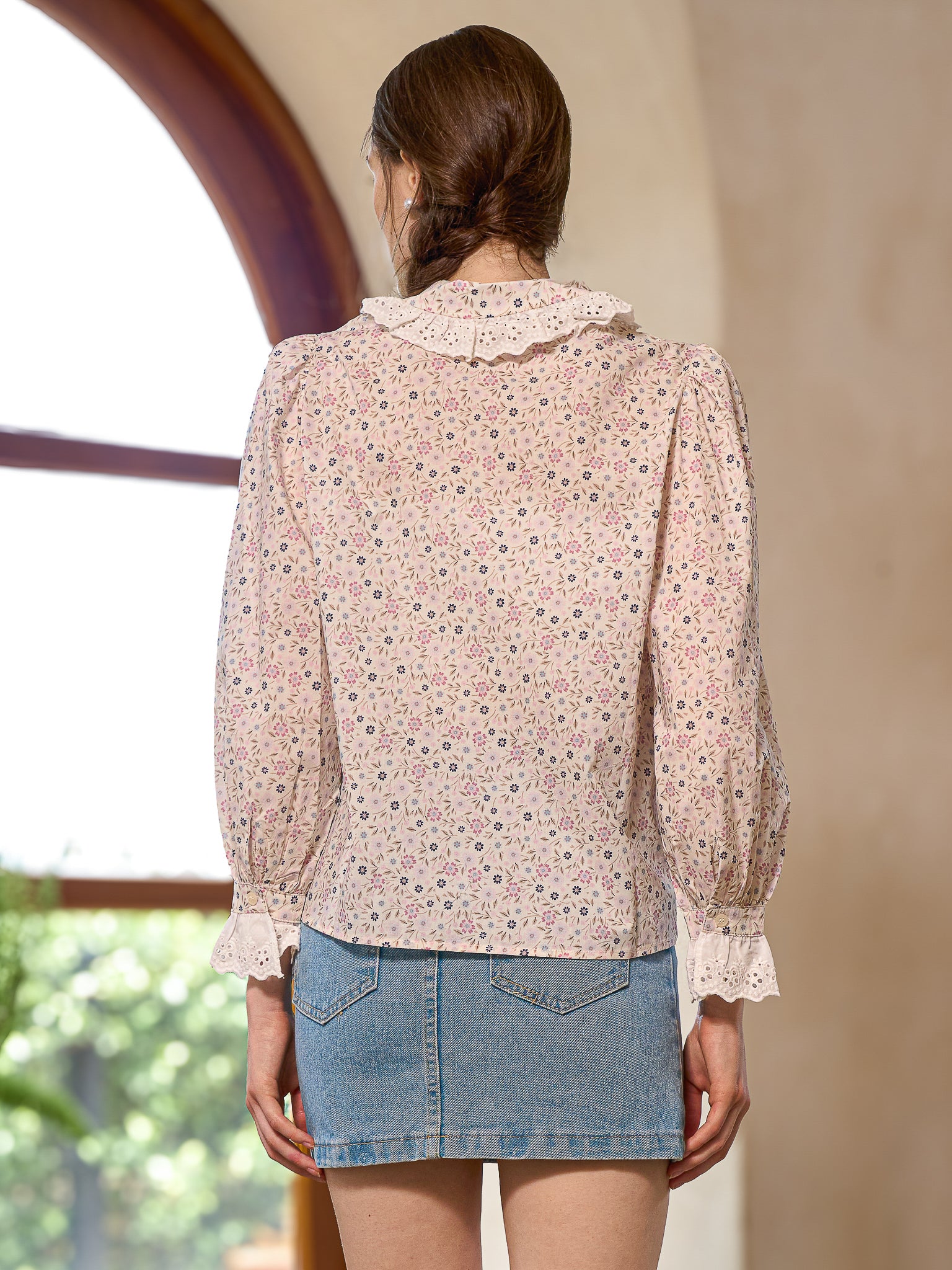 Romantic floral blouse features delicate lace trims on the collar and cuffs, adding a vintage-inspired charm to your everyday look.